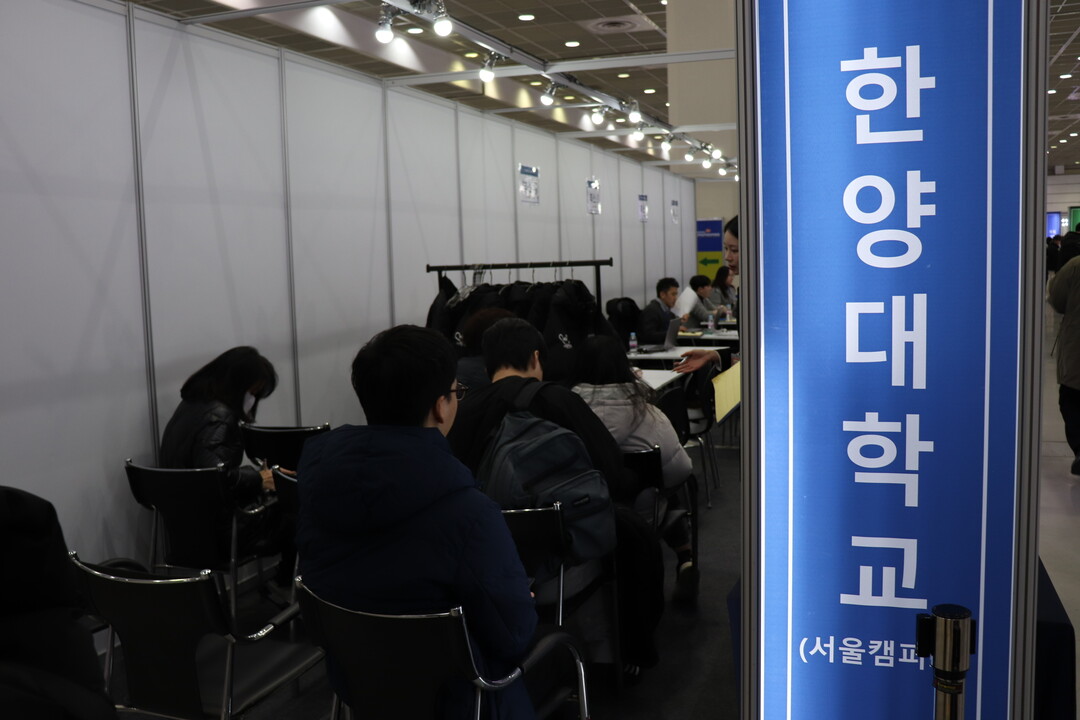 사진은 한양대학교 부스에서 입시 상담을 받고 있고 있는 수험생들의 모습이다.