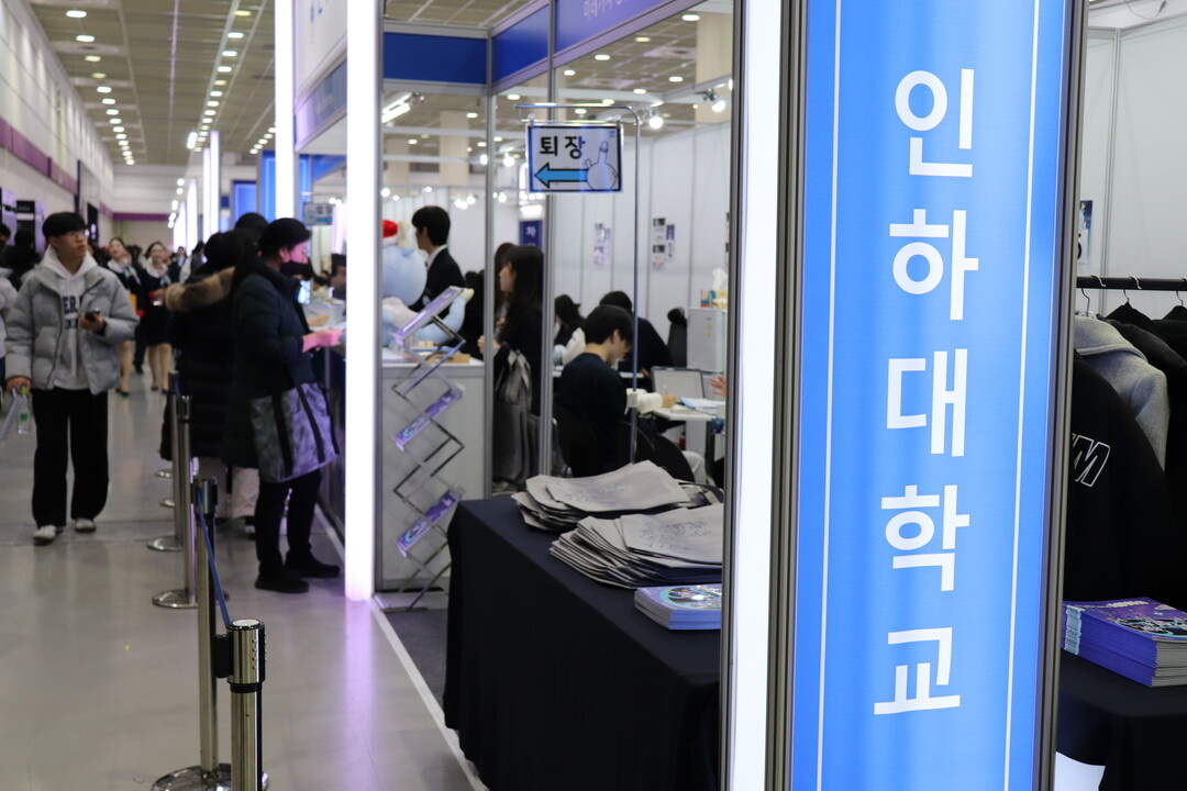 사진은 인하대학교 부스에서 입시 상담을 받고 있고 있는 수험생들의 모습이다.