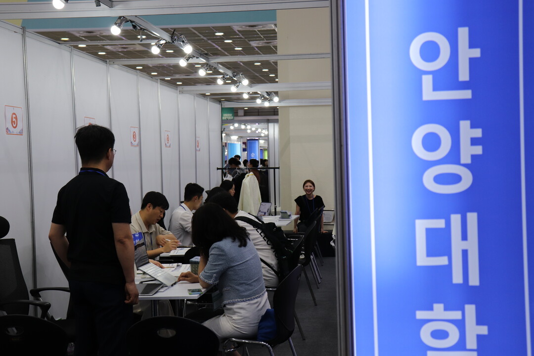 [대학저널 이선용 기자] 2025학년도 대입 수시모집을 앞두고 수험생과 학부모들이 입학 정보를 얻기 위해 발걸음을 재촉하고 있다. 이런 가운데 한국대학교육협의회는 수험생들의 궁금증 해소와 알찬 정보 제공을 위해 ‘2025학년도 수시 대학입학정보박람회’를 7월 25일부터 27일까지 3일간 서울 삼성동 코엑스에서 개최하고 있다. 2025학년도 수시 대학입학정보박람회는 지역 거점 국·공립대학, 수도권 대학 등 전국 149곳이 참가했으며, 수험생들은 대학별 입학전문가와 일대일 맞춤형 상담 진행할 수 있다. 사진은 안양대학교 부스에서 입시 상담을 받고 있는 수험생들의 모습이다.