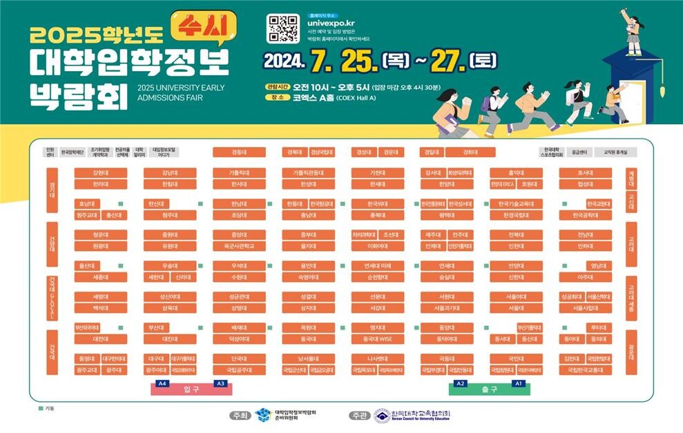 한국대학교육협의회(이하 대교협)는 7월 25~27일 3일간 서울 삼성동 코엑스 1층 A홀에서 전국 149개 대학이 참가하는 ‘2025학년도 수시 대학입학정보박람회’를 개최한다고 23일 밝혔다.