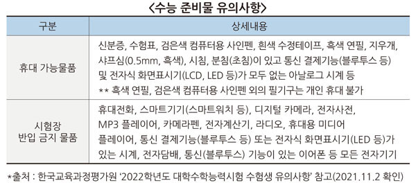 [대학저널 백두산 기자] 오는 18일 실시되는 2022학년도 대학수학능력시험은 지난 1일부터 단계적 일상회복(위드 코로나)으로 방역체계가 전환됐지만 기존 발표 내용 큰 변화 없이 시행될 예정이다. 다만 한 교실에서 여러 명이 시험을 치르기 때문에 각별한 주의가 필요하다. 우연철 진학사 입시전략연구소장의 도움을 받아 수능 당일 챙겨야 할 물품과 가져가면 안 되는 물품을 정리했다.