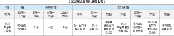 정시모집 원서접수는 오는 12월 30일부터 2022년 1월 3일 사이에 대학이 자율적으로 3일 이상 실시하며, 모집군별 전형기간은 ▲가군: 2022년 1월 6~13일 ▲나군: 2022년 1월 14~21일 ▲다군: 2022년 1월 22~29일이다. 합격자 발표는 2022년 2월 8일까지다.