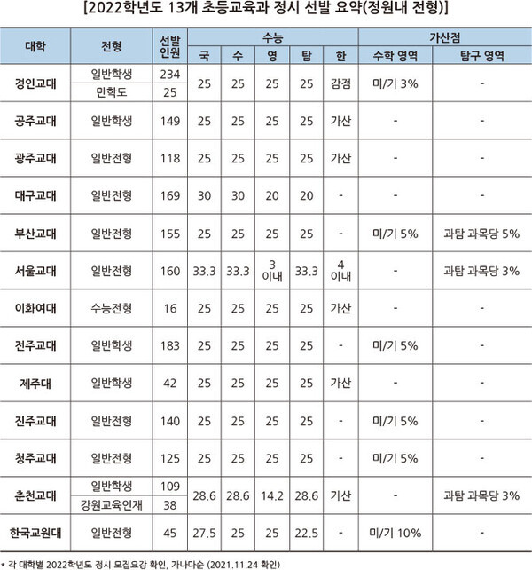2022학년도 정시 모집에서 초등교육과는 13개 대학이 총 1708명(정원내 선발)을 선발한다. 이화여대가 올해 나군으로 모집 군을 변경함에 따라, 가군에서는 한국교원대 초등교육과(45명)만 선발하고 나머지 12개 대학들은 모두 나군에서 선발한다. 그 중 선발인원이 가장 많은 대학은 경인교대로 일반학생전형 234명, 만학도전형 25명을 선발한다.
