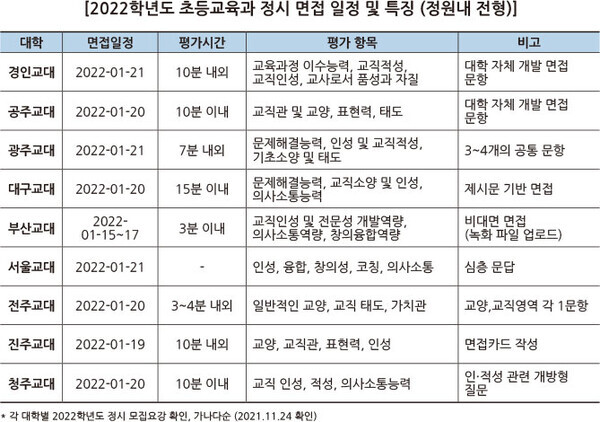 많은 초등교육과가 면접을 치르지만 이화여대, 제주대, 춘천교대, 한국교원대는 수능 성적만으로 학생을 선발한다. 이 중 춘천교대와 한국교원대는 전년도 면접이나 교과 성적을 반영해 최종합격자를 선발했으므로 전년도 입시결과를 참고할 때 주의해야 한다.