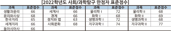 수능활용지표에 따른 유·불리는 탐구영역에서도 나타난다. 2022학년도 수능 탐구영역에서 정치와 법 만점자의 표준점수는 63점이지만, 사회문화 만점자의 표준점수는 68점이다. 또 화학Ⅰ은 68점이지만 지구과학Ⅱ는 77점으로, 동일하게 만점을 받았음에도 과목에 따라 점수 차이가 크다.