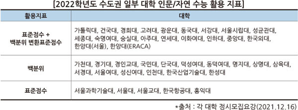 [대학저널 백두산 기자] 2022학년도 대학 입시 정시모집에서 같은 대학수학능력시험 성적이라도 대학의 수능 영역별 반영 비율과 반영 영역에 따라 유리한 대학과 불리한 대학이 달라진다. 수학 점수가 높은 학생에게는 수학 반영 비율이 높은 대학이 유리할 수 있다는 생각은 상식적으로 보인다. 하지만 그만큼 중요한 ‘대학이 어떤 수능 지표를 활용하는지’, ‘이를 어떻게 활용해야 할지’에 대해서는 미처 고려하지 못하는 경우가 많다. 우연철 진학사 입시전략연구소장의 도움을 받아 정시에서 수능 활용지표를 최대로 활용하는 방법에 대해 알아봤다.