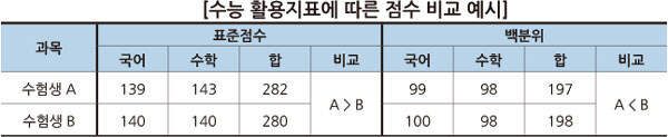 의대를 지원하고자 하는 두 수험생의 국어와 수학 표준점수가 수험생 A는 국어 139점, 수학 143점이고 수험생 B는 국어 140점, 수학 140점이라고 하자. 표준점수로만 계산하면 A의 점수가 더 높다. 특히 의대가 수학 반영 비율이 높은 것을 감안하면 두 학생의 점수 차는 의미 있게 벌어진다. 하지만 백분위를 적용하는 곳에서는 상황이 달라진다. 표준점수로 B가 1점이 더 높은 국어 영역은 백분위도 1점이 높지만, A가 표준점수 3점이나 높은 수학은 백분위는 동일하기 때문에 결과적으로 백분위를 활용하는 대학에서는 수험생 B가 우위에 있게 된다. 의대에 지원하고자 한다면 B학생은 백분위를 적용하는 가천대, 강원대 등이 유리한 상황인 것이다.