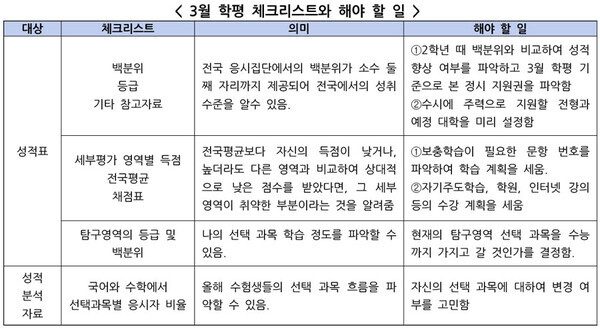 입시 전문가들은 3월 학평은 자신의 위치 탐색과 함께 자신의 취약점을 찾는 것을 목표로 해야 한다고 입을 모았다. 특히, 3월 학평이 끝난 뒤 결과를 감안해 목표 대학을 점검하고 수시와 정시, 학생부 위주 전형과 논술전형 등 자신의 진학 유형을 진지하게 고민해야 한다고 조언했다.