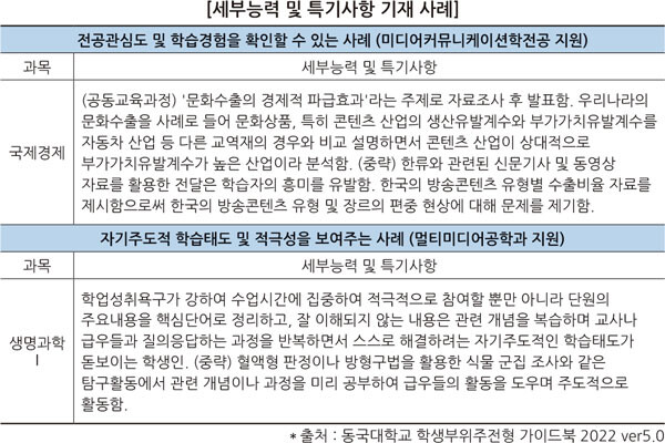 무엇보다 대학은 학교생활기록부의 다양한 항목을 통해 학생의 학업역량과 전공적합성, 발전가능성, 인성 등을 확인해 학생을 선발한다. 이 때 가장 중요한 항목은 창의적 체험활동과 세부능력 및 특기사항이다.
