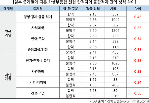 진학사에 따르면 인문계열 모집단위에 학생부종합전형으로 합격한 학생의 내신 평균 등급은 2.25였으나 불합격자은 2.67로 나타났다. 자연계열 모집단위는 합격자 내신 평균 등급은 2.07이었고, 불합격자는 2.36이었다.