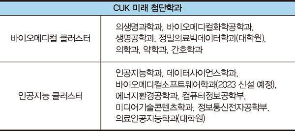 가톨릭대의 ‘첨단학과 클러스터’는 바이오메디컬화학공학과(2020학년도), 의생명과학과(2021학년도), 생명공학과가 중심이 되는 ▲바이오메디컬 클러스터와 인공지능학과(2021학년도), 데이터사이언스학과(2022학년도), 바이오메디컬소프트웨어학과(2023학년도), 의료인공지능학과(대학원, 2020학년도)를 주축으로 한 ▲인공지능 클러스터 등 두 축으로 구성된다.