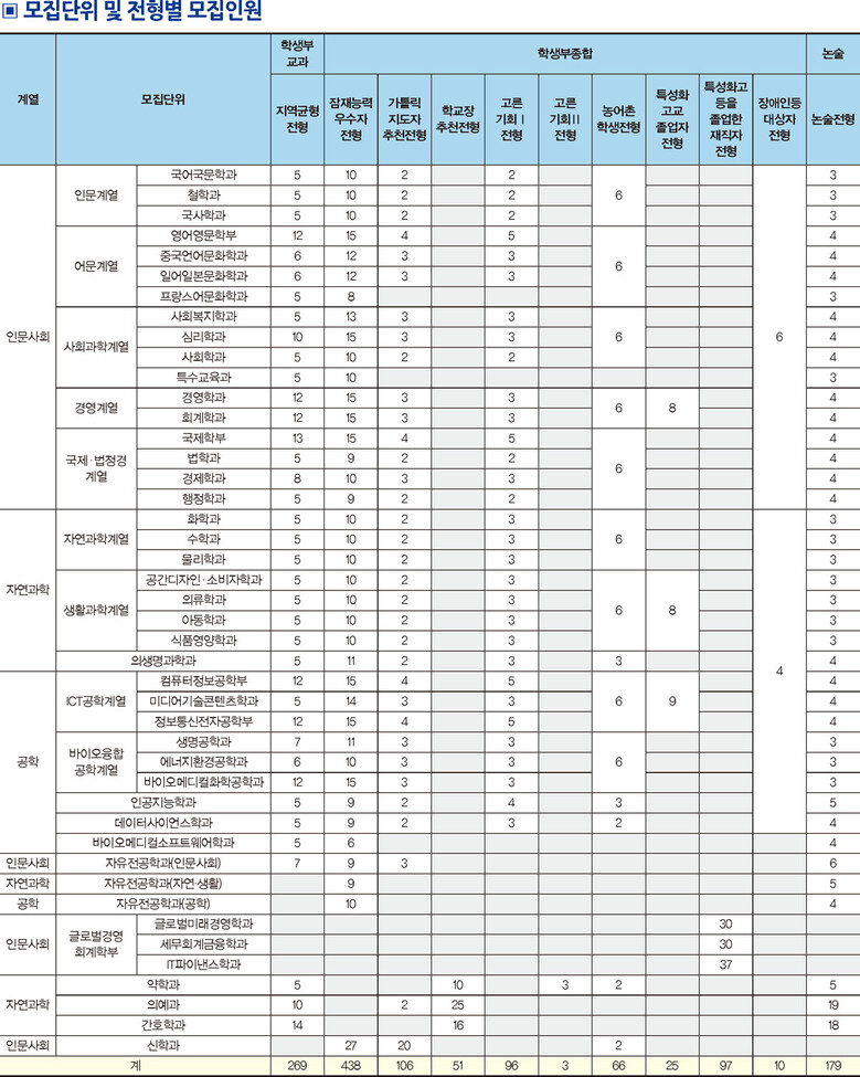 수시모집 인원 증가, 약학과 논술전형 선발, 신설학과 장학 혜택 등 많은 변화