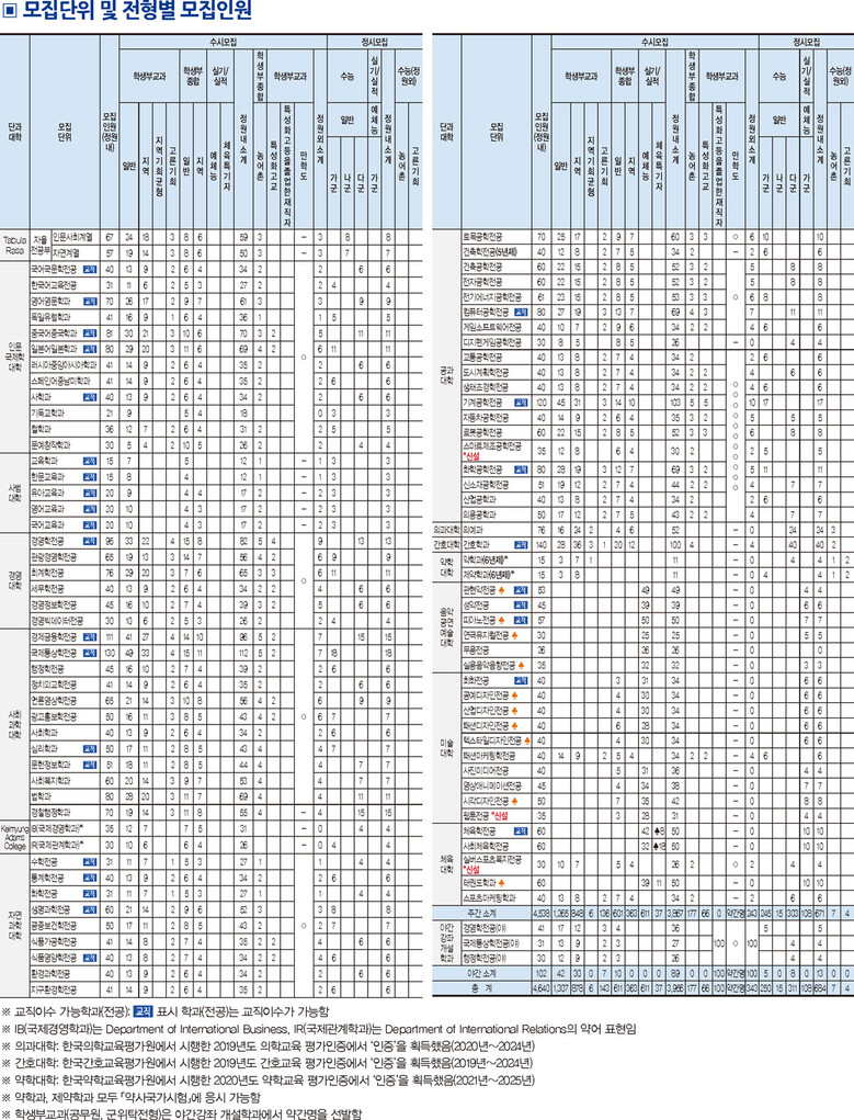 학생부종합(일반전형)에는 면접이 폐지돼 서류 100%를 반영하며, 학생부를 바탕으로 교과영역과 비교과영역을 종합적으로 평가, 선발한다. 면접을 실시하는 학생부종합(지역전형)은 전년도와 동일한 방법으로 선발하되, 1단계 선발인원을 4배수에서 5배수로 확대한다. 학생부종합(일반, 지역전형) 의예과는 전년과 동일하게 1단계 7배수를 선발해 2단계에서 수능 최저학력기준이 적용된다.