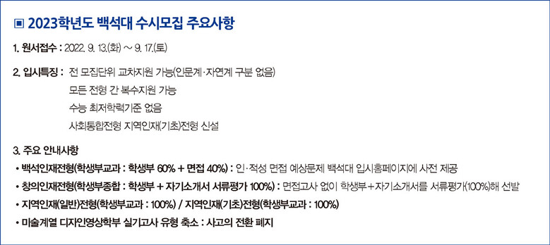 원서접수는 2022년 9월 13일(화)부터 9월 17일(토)까지이며, 면접 · 실기고사는 10월 20일(목)~22일(토)과 10월 27일(목)~29일(토)에 각각 진행된다.