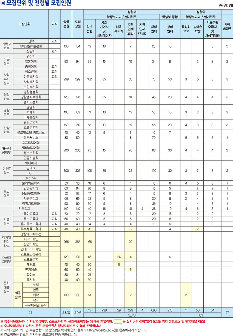 백석대는 정원내에서 일반전형 1154명, 사회기여자 및 배려대상자전형 238명, 지역인재(일반) 전형 279명, 지역인재(기초) 전형 4명, 백석인재 전형 696명, 창의인재 전형 276명, 체육특기자 29명을 선발한다.