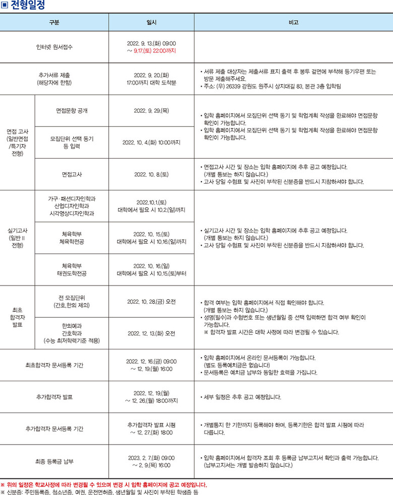 상지대는 2023학년도는 이월인원과 정원외 모집을 포함해 총 1951명을 모집하며, 정원내 인원 중 수시모집으로 1649명, 정시모집으로 156명을 선발한다.