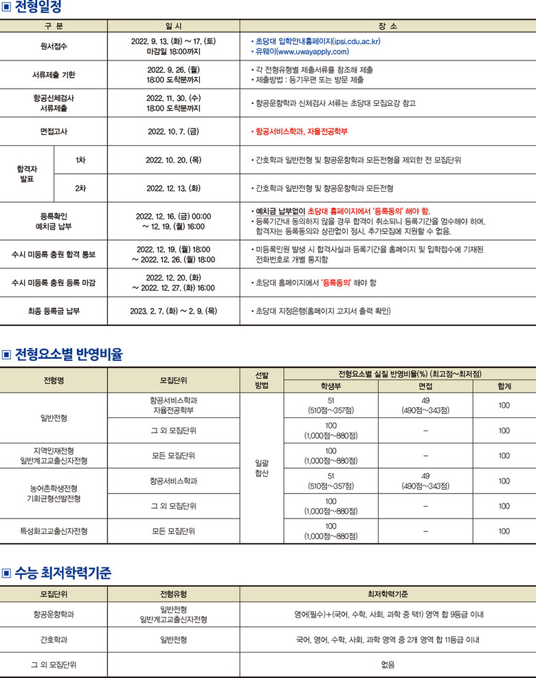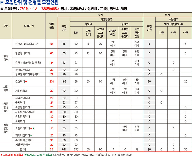 수능 최저학력기준은 학생들에게 부담되지 않는 수준에서 ▲간호학과(일반전형)는 국어, 수학, 영어, 사회, 과학 영역 중 2개 영역 합이 11등급 이내 ▲항공운항학과(일반전형, 일반계고교출신자전형)는 영어를 필수로 국어, 수학, 사회, 과학 중 택1의 영역의 합이 9등급 이내면 된다.