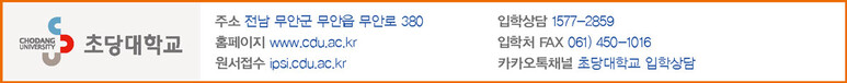 초당대 입학과 관련한 문의는 방문상담과 전화상담(1577-2859), 홈페이지를 통한 상담뿐만 아니라 카카오톡 채널(초당대학교 입학상담)을 통한 실시간 상담도 가능하다. 세부 모집요강은 초당대 입학안내홈페이지(http://admission.cdu.ac.kr)를 참고하면 된다.