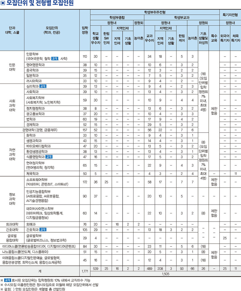 학생부종합전형은 1단계에서 모집인원의 4배수(의예과 5배수) 내외를 선발하며, 1단계 합격자를 대상으로 2단계 면접을 진행한다. 면접은 학생부와 자기소개서를 바탕으로 평가하기 때문에 고등학교 생활에서 뚜렷한 목표를 갖고 교과영역과 비교과영역을 충실히 수행하고, 학생부종합전형을 착실하게 준비한 수험생에게 적합하다.