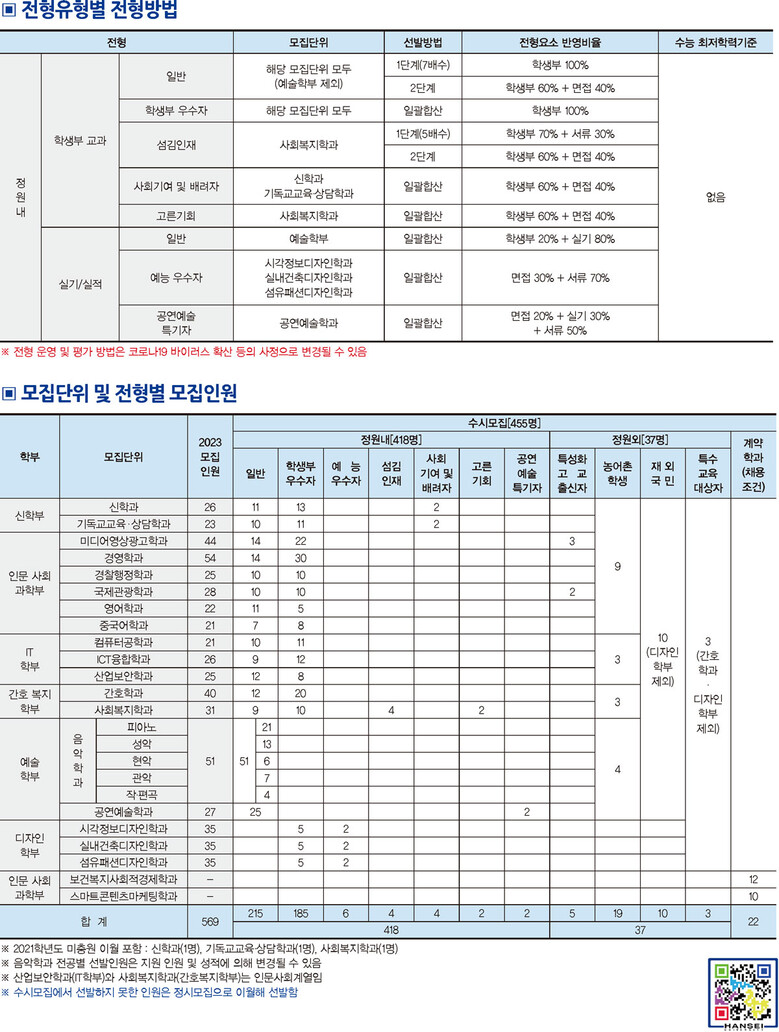 “학생부는 교과 성적만을 반영하며 인문사회계열인 신학부, 인문사회과학부, 산업보안학과, 사회복지학과와 예능계열인 디자인학부, 예술학부는 국어, 영어, 사회 성적을 반영한다. 공학계열인 컴퓨터공학과, ICT융합학과는 수학, 영어, 과학 성적을 반영한다. 자연계열인 간호학과는 국어, 수학, 영어, 사회 또는 과학 성적을 반영한다.