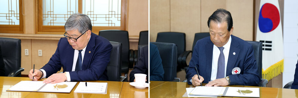 왼쪽부터 박성태 원광대 총장과 이선홍 대한적십자사 전북지사 회장. 사진=원광대 제공 |