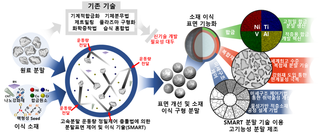 KAIST 원자력및양자공학과 류호진 교수 연구팀은 신소재 합금 및 금속복합재 개발에 필요한 고부가가치 분말을 생산하는 분말 표면 제어 및 강화 이식 기술을 개발했다. 이번 연구에는 한국원자력연구원(김재준 박사), 한국재료연구원(김정환 박사, 이동현 박사)이 참여했다.