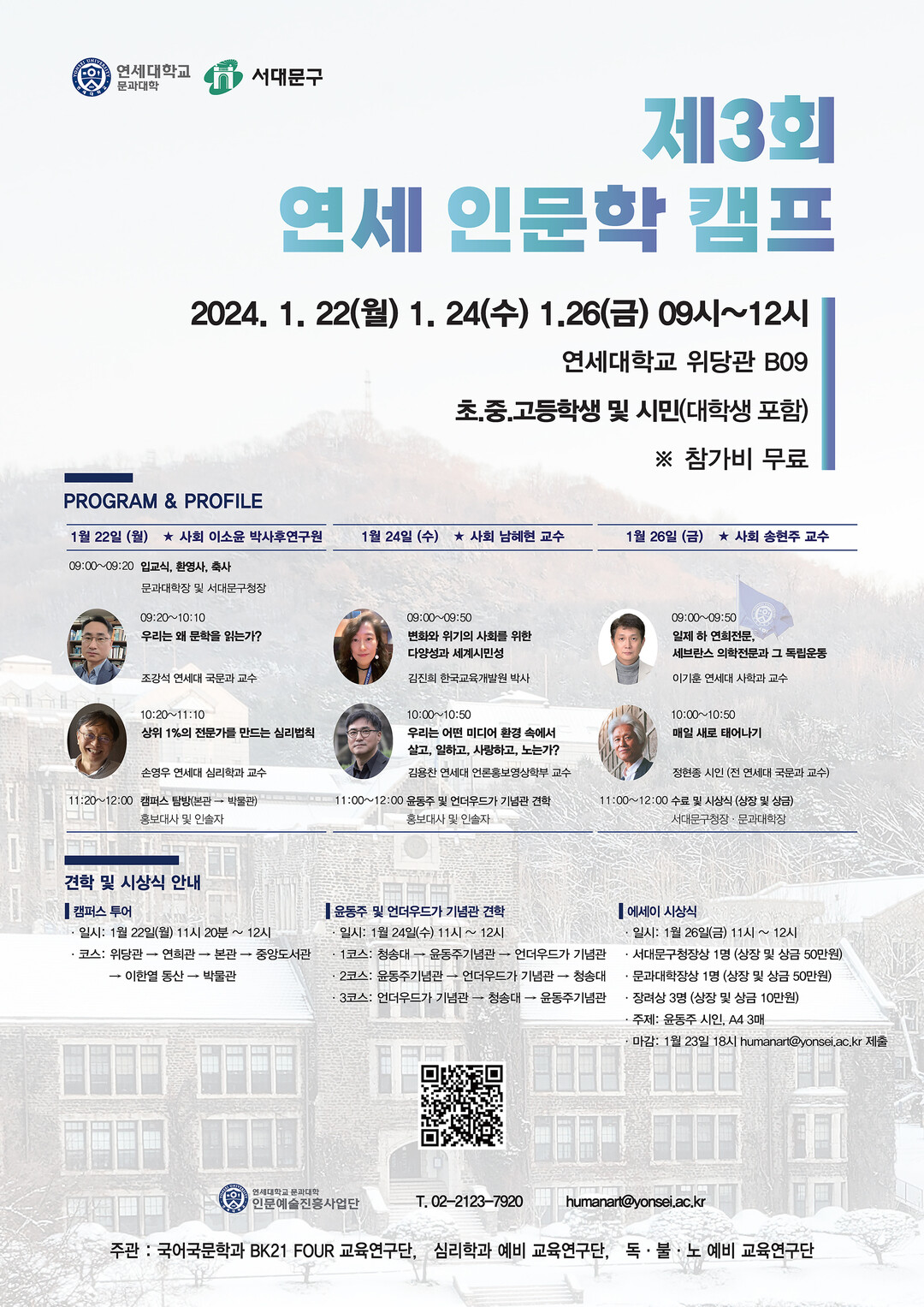 [대학저널 이선용 기자] 연세대학교 문과대학 인문예술진흥사업단이 1월 22일, 1월 24일, 1월 26일 3일에 걸쳐 연세대 위당관에서 초·중·고등학생과 대학생 및 학부모 등 시민을 대상으로 ‘제3회 연세 인문학 캠프’를 개최한다.