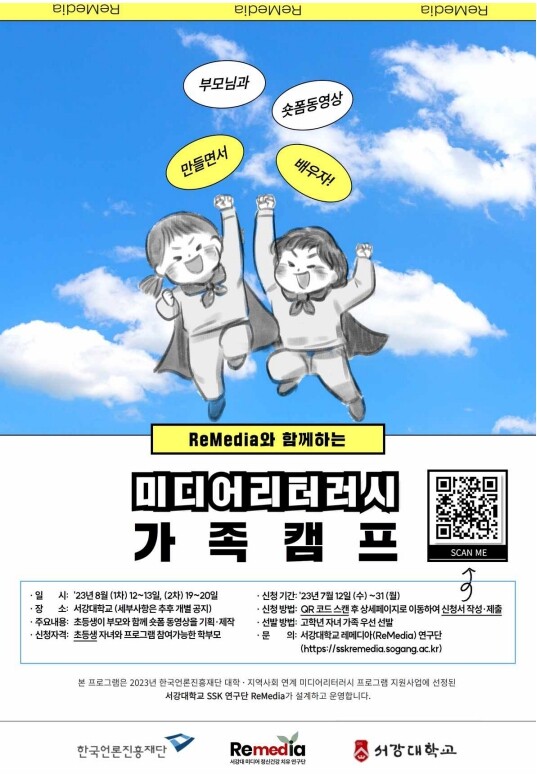 [대학저널 온종림 기자] 서강대학교 SSK연구단 ReMedia가 오는 31일까지 미디어 리터러시 가족 캠프에 참가할 가족들을 모집한다.