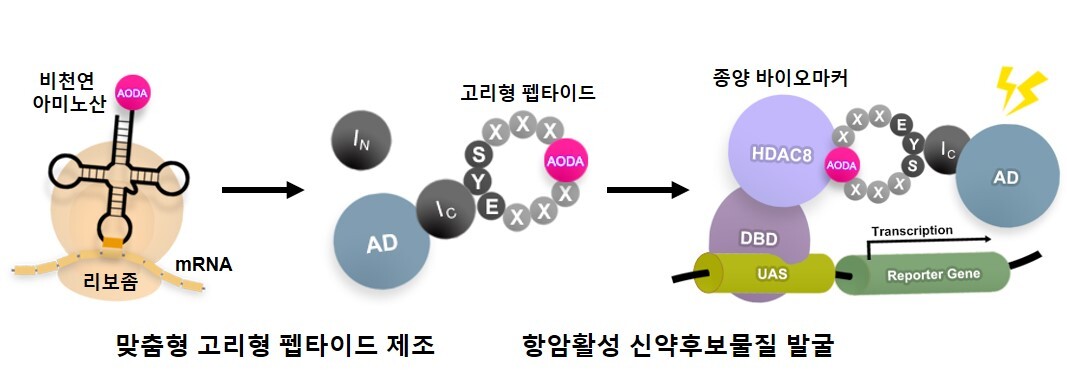 연구팀은 이 기술을 활용해 비정상적인 단백질에 결합하여 다양한 종류의 암을 유발하는 원인으로 알려진 종양 바이오마커인 HDAC8(histone deaceytylase 8)의 활성을 저해하는 고리형 펩타이드를 효과적으로 발굴할 수 있음을 증명했다.