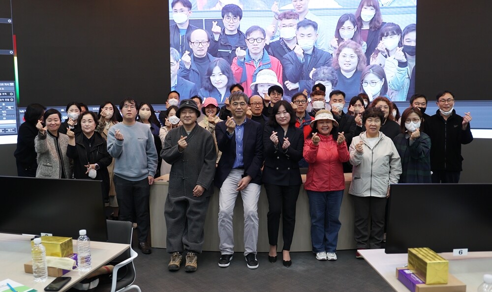 김승현(앞줄 가운데) 인하대 평생교육원장과 시민 등이 청년시민캠퍼스 개강식에서 손하트를 만들어보이며 기념촬영하고 있다. 사진=인하대 제공 |