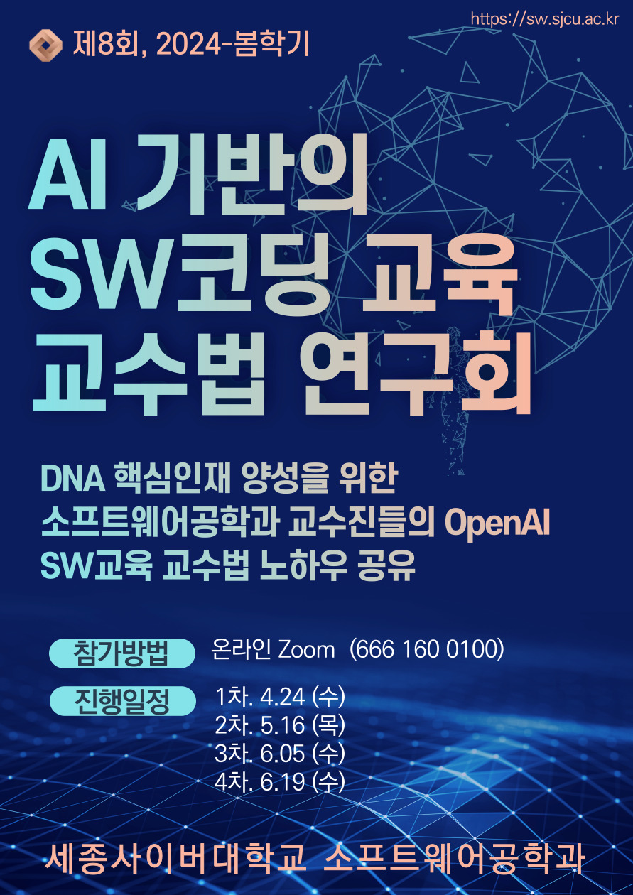 이번 교수법 연구회에서는 학과 교수진들이 교육과정에서 ▲AI를 활용한 강의 제작 기법 ▲온라인 강의 내 학습자 평가 방법 ▲학습자 상호 작용 방법 ▲평가 문제 출제 방법 ▲라이브 강의 소통 방법 등 교육과정에서 발생하는 다양한 사례를 공유하고, 이를 AI 기술을 사용해 개선 사례와 AI SW코딩 교육 활성화 방안에 대해 안내할 예정이다.