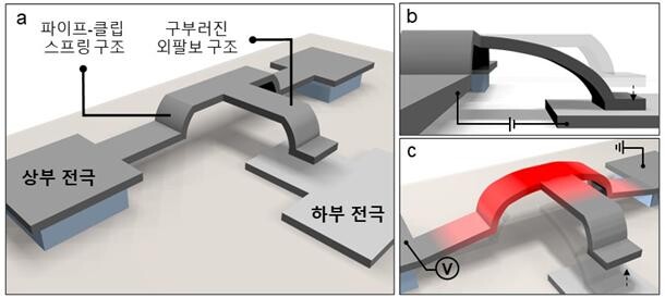 연구팀은 반도체 메모리를 사용하는 대신, 나노 크기의 매우 작은 기계 구조에 전기 신호를 가함으로써 나노 기계 구조체가 실제로 움직여서 하부 전극에 붙고 떨어지는 방식을 사용했다. 또한, 매우 낮은 프로그래밍 에너지를 달성하기 위해 파이프-클립 스프링 구조와 구부러진 외팔보 구조로 구성된 상부 전극을 도입했으며, 특히 파이프-클립 모양의 나노 기계 구조에 전류를 가해 열을 내는 구동 방식을 통해 프로그램된 구조체가 초기 상태로 복구할 수 있도록 해 반복적인 프로그램 동작에도 낮은 프로그래밍 에너지를 유지할 수 있도록 했다.