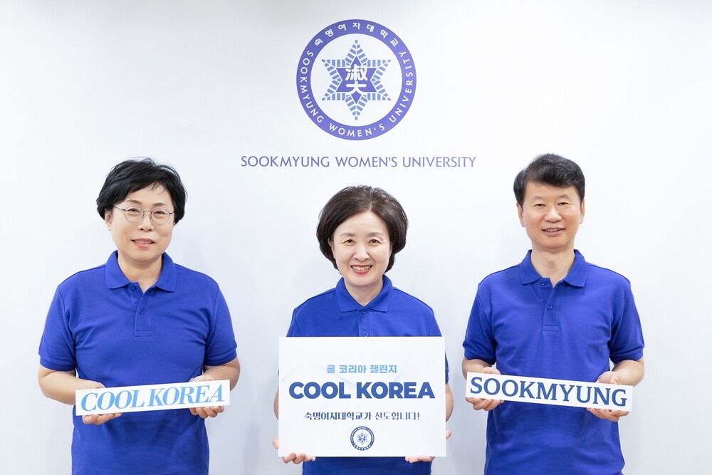 숙명여대는 26일 공식 인스타그램에 장윤금 총장, 박종성 부총장, 김용화 사무처장이 파란색 반팔 티셔츠를 입고 쿨 코리아 챌린지에 참여하는 사진을 게시했다.