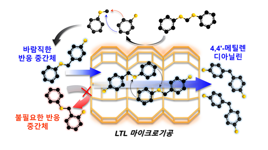 메조기공을 통해 확산된 바람직한 반응 중간체만 LTL 제올라이트의 마이크로 기공 내부에서 반응하여 4,4’-메틸렌디아닐린을 선택적으로 생성하는 반응 메커니즘. |