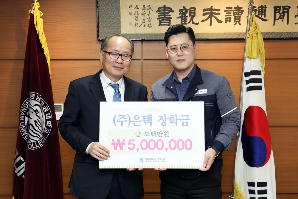 이날 장학금 기탁식에서 ㈜은텍 송수환 대표는 영남이공대 이재용 총장에게 모교의 발전과 후배들의 학업 증진을 위한 장학금 500만원을 전달했다.