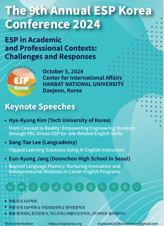이번 제9회 학술대회 주제는 ‘ESP in academic and professional contexts: challenges and responses’이며, 관련 분야의 국내.외 전문가 100여 명이 참석해 다양한 논문 발표와 토론을 진행할 예정이다.