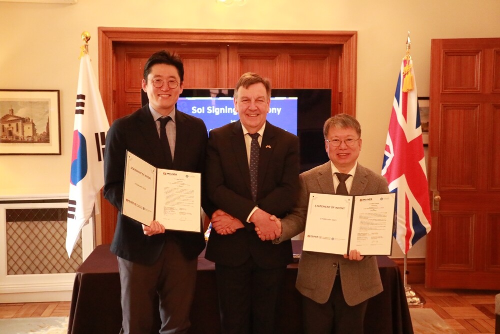 연세대학교 미래캠퍼스와 영국 케임브리지대학 바이오메디컬 캠퍼스 밀너의약연구소 관계자들이 의향서를 체결한 뒤 기념촬영하고 있다. 왼쪽부터 한남식 케임브리지대학 밀너의약연구소 인공지능연구센터장, 존 위팅데일 한국 무역 특사, 권명중 연세대 미래캠퍼스 부총장. 사진= 연세대 미래캠퍼스 제공 |
