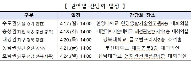 간담회는 17일 수도권역을 시작으로 충청권(대전·세종·충남·충북), 대경권(대구·경북·강원), 동남권(부산·울산‧경남), 호남권(광주·전남·전북·제주) 순으로 열리며, 각 권역별 대학과 지자체 등 현장 의견을 청취할 예정이다.