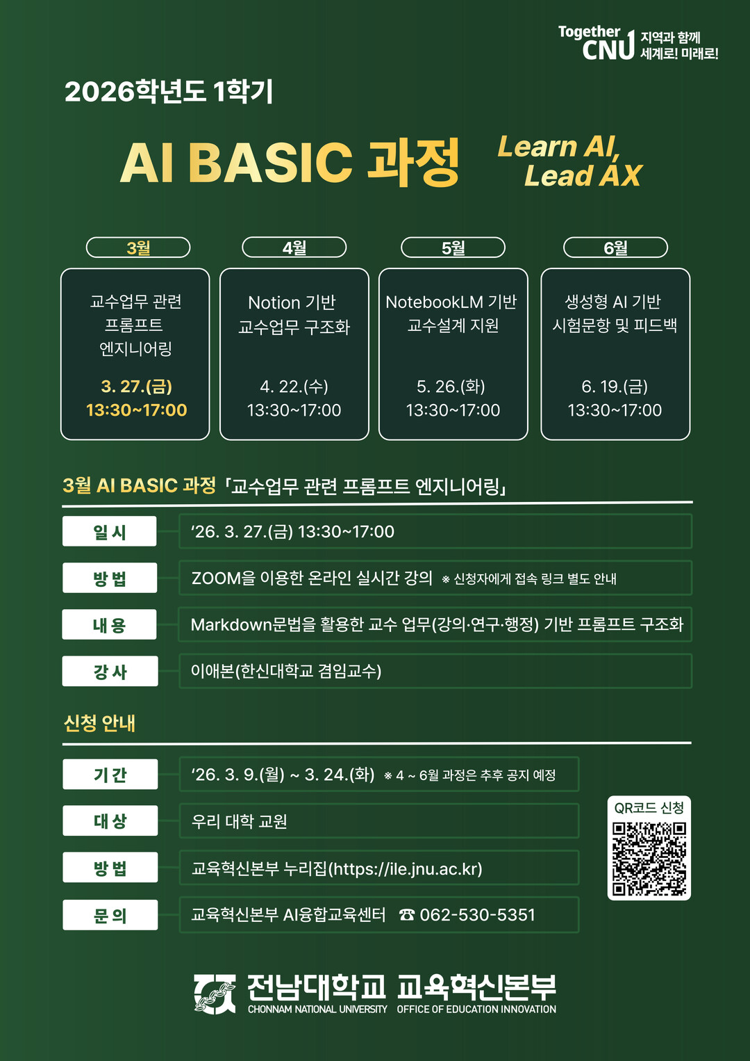 전남대 교육혁신본부는 2026학년도 1학기 전 교원을 대상으로 ‘AI BASIC 과정’을 운영한다고 10일 밝혔다.