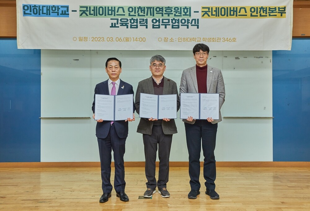 [대학저널 온종림 기자] 인하대학교는 최근 굿네이버스 인천본부 및 굿네이버스 인천지역후원회와 지역사회 기여와 학생들의 올바른 인성 함양을 위한 업무협약을 체결했다고 13일 밝혔다.