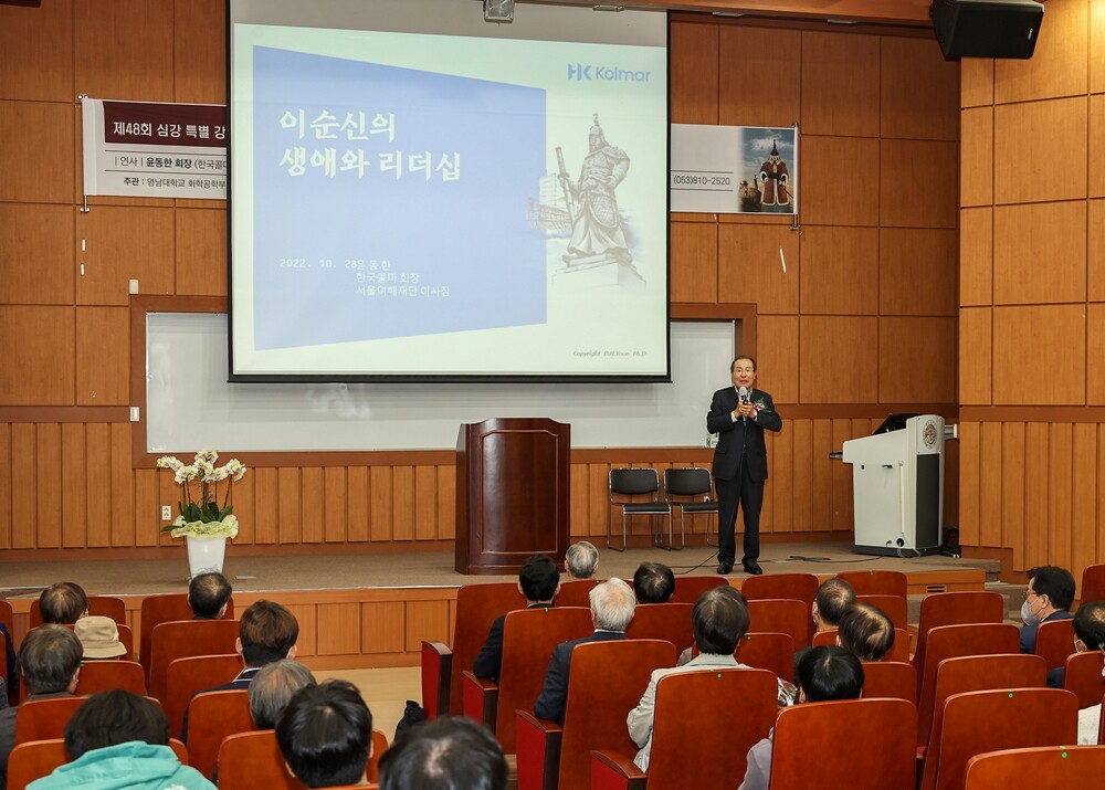 지난 10월 윤동한 한국콜마 회장이 제48회 심강특별강연회 연사로 초청돼 특강을 하고 있다. |