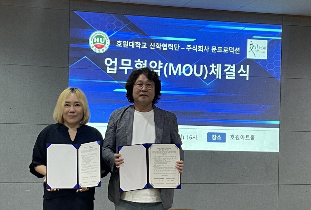 호원대가 (주)문프로덕션과 인재양성을 위한 업무협약을 체결했다. 사진=호원대 제공 |
