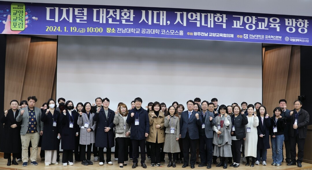 지난 1월 19일 열린 ‘기술혁신시대 교양교육의 방향’ 포럼 참가자들이 기념촬영을 하고 있다. 사진=전남대 제공 |