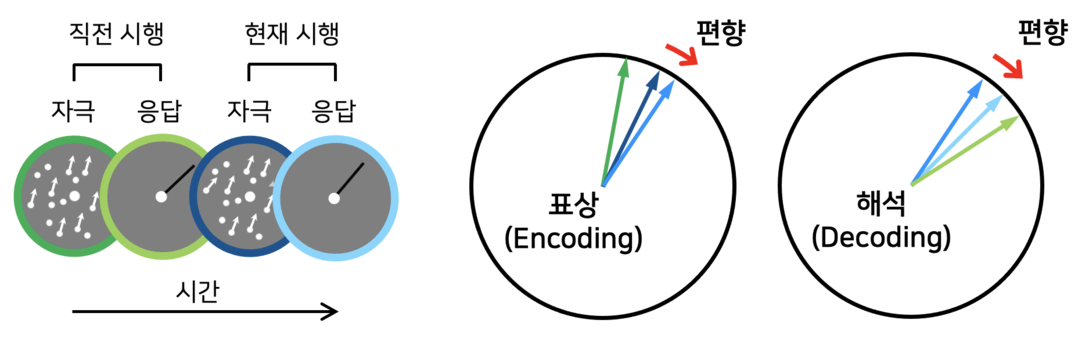 이번 연구에서 실험 참가자는 같은 방향으로 움직이는 점들을 보고, 그 방향을 보고하는 과제를 수행했다. 여러 번 진행된 과제에서 참여자들은 직전에 수행한 결과에 영향을 받아 편향된 응답을 내놓았다. ‘직전 시행에서 점들이 움직인 방향(실제 객관적 자극)’과 멀어지는 쪽이자, ‘직전에 응답한 방향(주관적 판단)’과는 비슷한 쪽이었다.