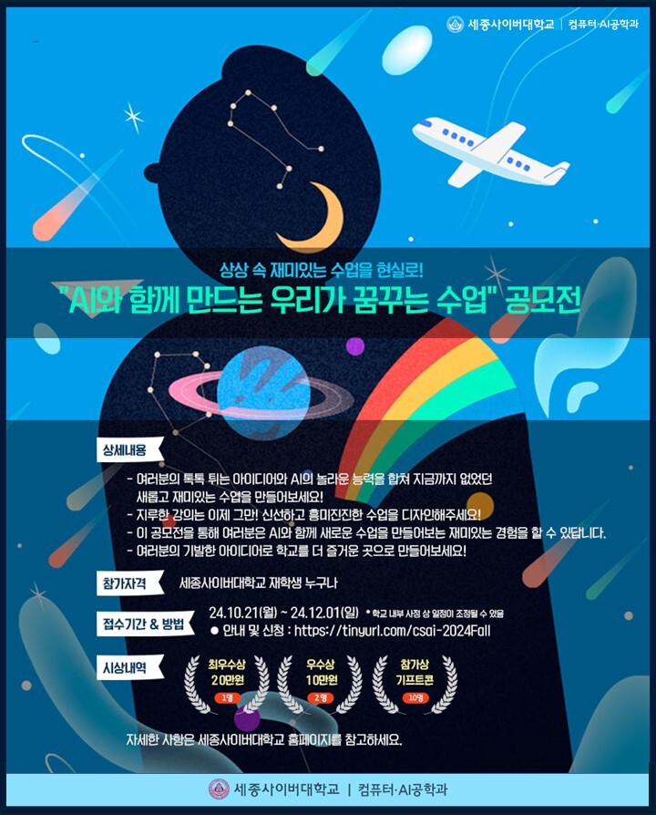공모전은 오는 12월 1일까지 온라인으로 접수를 받으며, 세종사이버대 재학생이라면 누구나 참여할 수 있다. 참가 방법 등 자세한 내용은 세종사이버대 컴퓨터·AI공학과 홈페이지에서 확인할 수 있다.