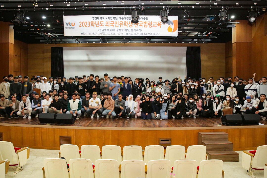 | 영산대에서 실시한 2023학년도 외국인 유학생 한국법령교육에 참석한 학생들이 기념촬영을 하고 있다. 사진=영산대 제공 |