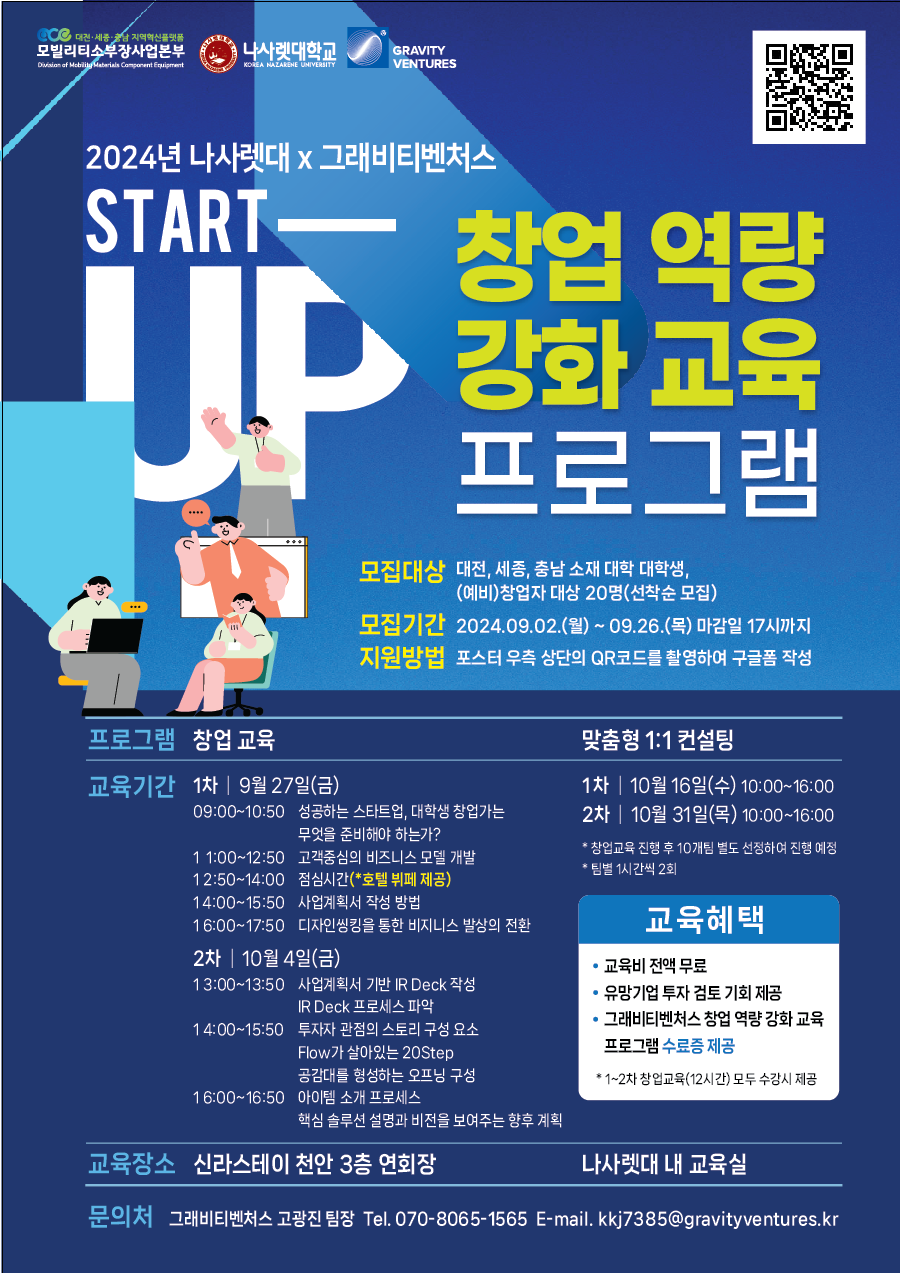 모든 교육 과정은 무료로 제공되며, 우수 참가자에게는 투자 검토의 기회와 더불어 글로벌 전문 액셀러레이터이자 전문 투자사인 그래비티벤처스에서 제공하는 창업 역량 강화 프로그램 수료증이 발급된다.