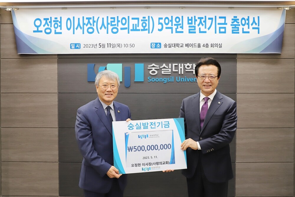 [[대학저널 온종림 기자] 학교법인 숭실대학교 오정현 이사장(사랑의교회 담임목사)이 11일모교인 숭실대에 발전기금 5억 원을 출연했다.