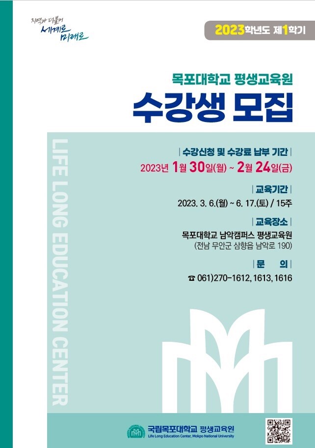 이진형 평생교육원장은 “목포대 평생교육원은 지역민의 든든한 평생학습 동반자로서 안전한 교육환경을 조성하고 양질의 교육과정을 지속적으로 운영해 왔다”며 “앞으로도 지역민의 평생학습 요구에 부응하는 다양한 강의를 개설·운영하는데 최선을 다하겠다”고 말했다.