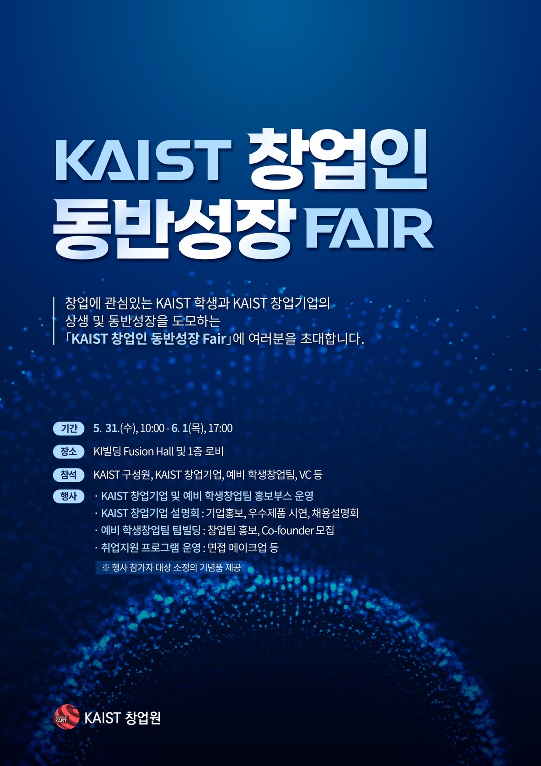 오는 31일부터 이틀간 대전 본원 KI빌딩(E4) 퓨전홀에서는 ‘2023년 KAIST 창업인 동반성장 페어’를 개최한다. 창업에 관심 있는 KAIST 학생과 KAIST 창업기업이 상호 교류하는 자리다.